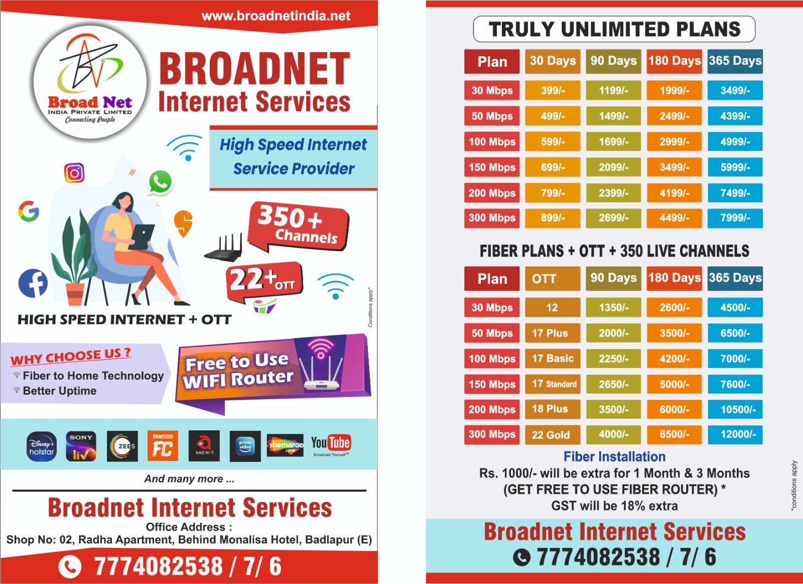 High-speed internet connections up to 1 Gbps with ethernet. Our every plans have best speed then any other internet service providers.